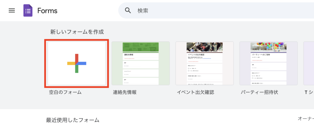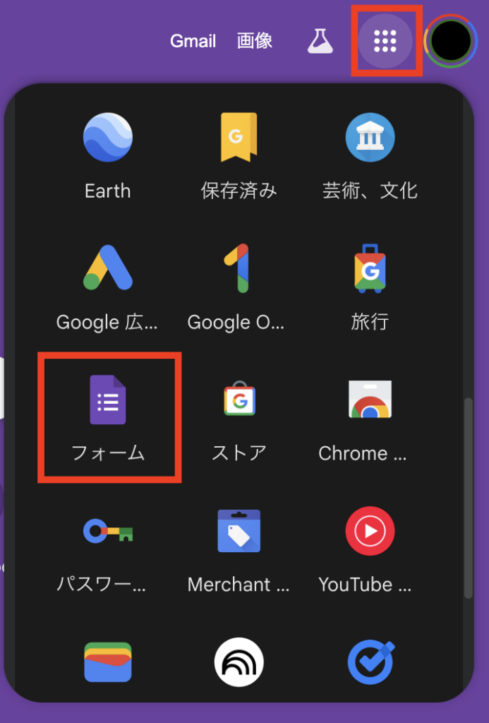 - 画面右上にある「Googleアプリ」一覧から「フォーム」を開く