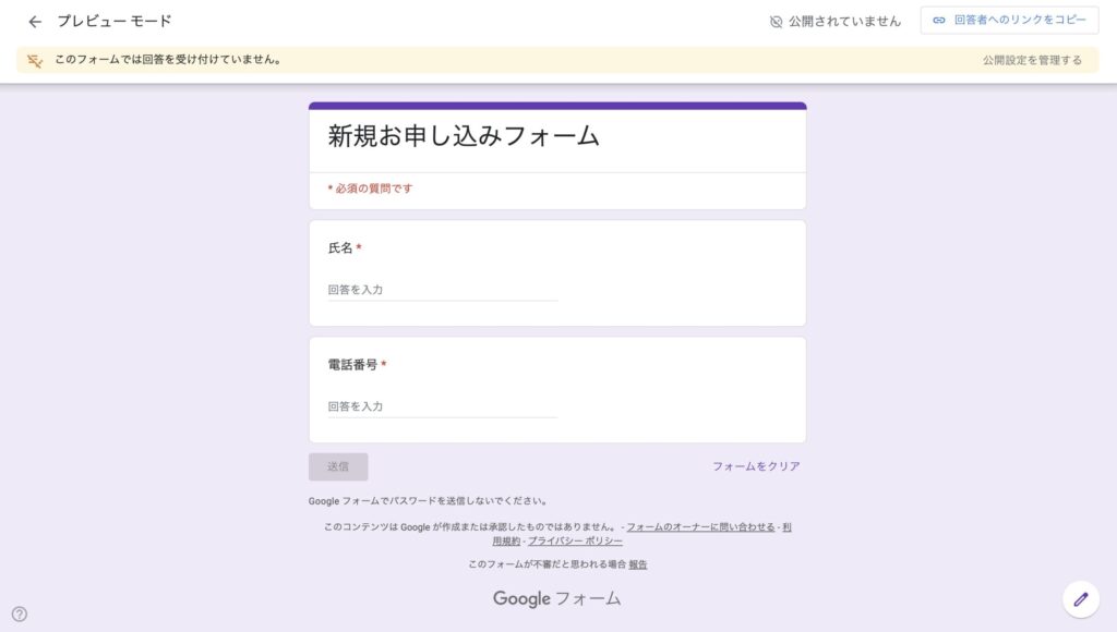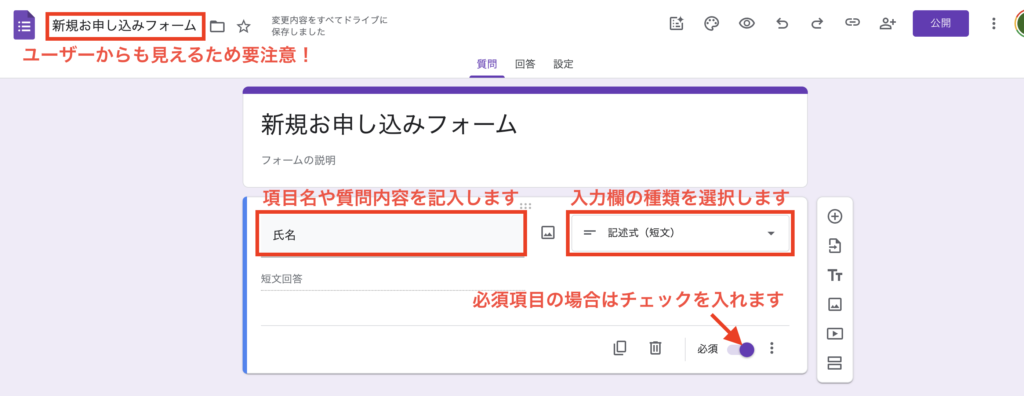 - 「フォームの名前」「質問内容」「入力欄の種類」を設定します