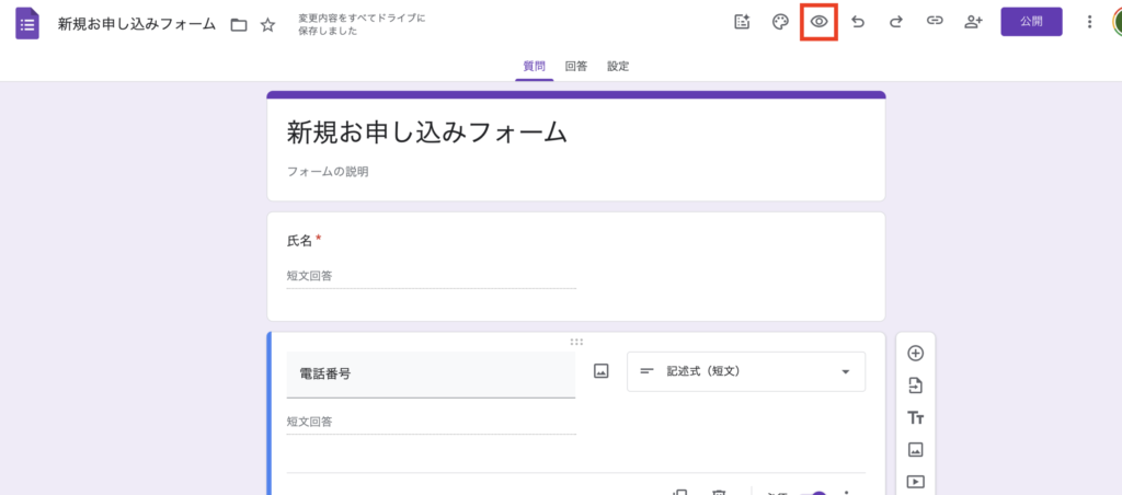 - 完成したら画面上部にある目のマークで「プレビュー」を確認します