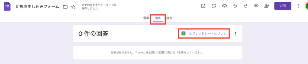 - 「回答」タブを開き「スプレッドシートにリンク」をクリックします