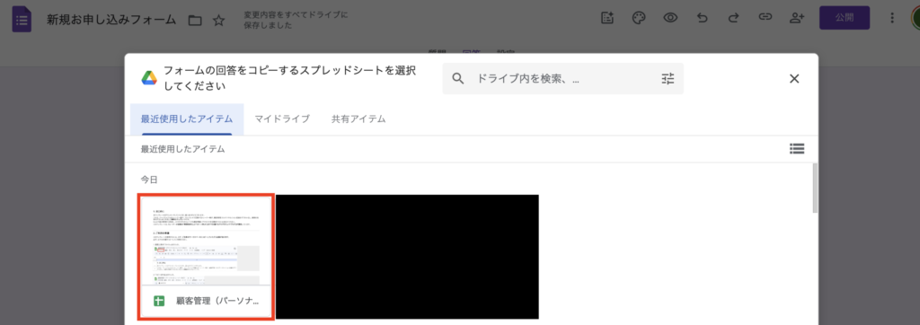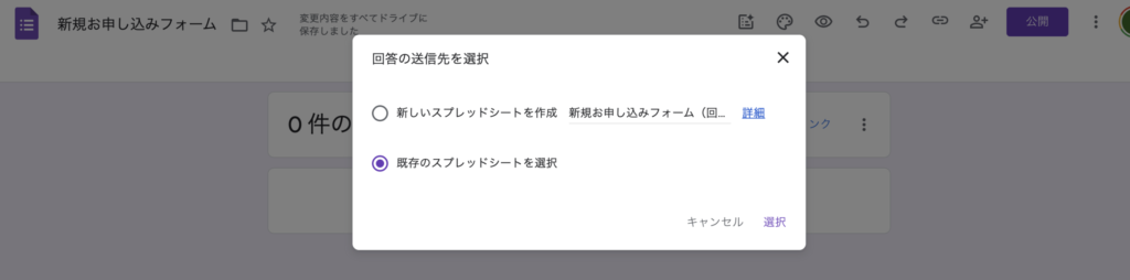 - 「既存のスプレッドシートを選択」を選択し、連携させたいスプレッドシートを選択します