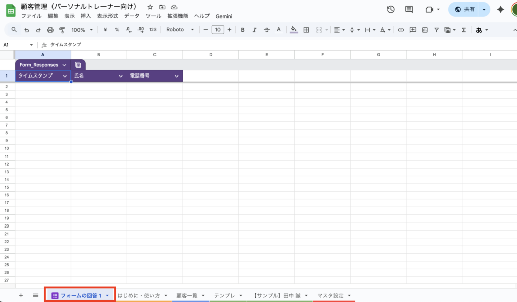 - 自動的にスプレッドシートが起動します。「フォームの回答」シートができていることを確認